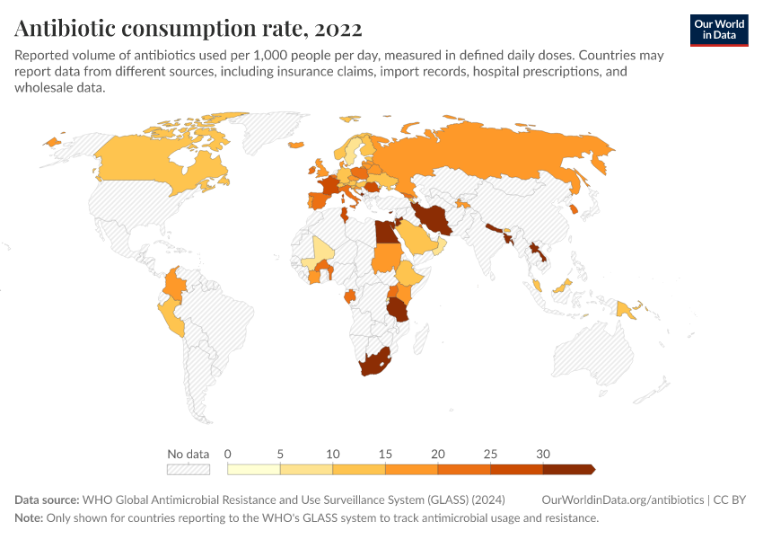 Saloni Dattani, Fiona Spooner, Hannah Ritchie, and Max Roser (2024) - “Antibiotics and Antibiotic Resistance” Published online at OurWorldinData.org. Retrieved from: 'https://country-profiles-in-search.owid.pages.dev/antibiotics' [Online Resource]BibTeX citation