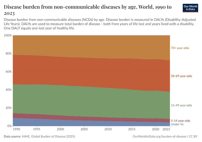 The chart also shows a notable shift since 1990, when communicable diseases held the highest share of the disease burden.