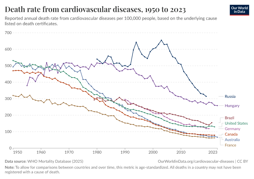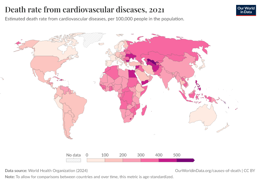 Saloni Dattani, Veronika Samborska, Hannah Ritchie, and Max Roser (2023) - “Cardiovascular Diseases” Published online at OurWorldinData.org. Retrieved from: 'https://country-profiles-in-search.owid.pages.dev/cardiovascular-diseases' [Online Resource]BibTeX citation