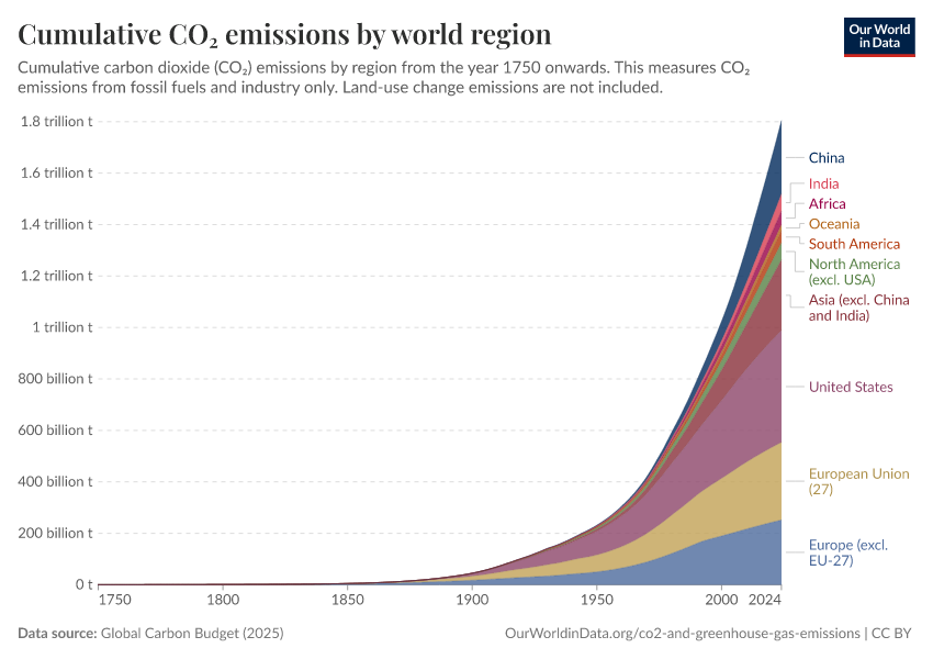 In the following chart, we see the change in the share of global cumulative emissions by region over time from 1751.
