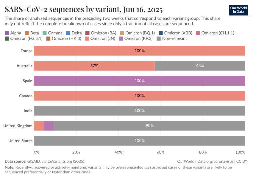 We obtain the share of cases of each variant by dividing the number of sequences labeled for that variant by the total number of sequences. Since only a fraction of all cases have their genome sequenced, this share may not reflect the complete breakdown of cases.