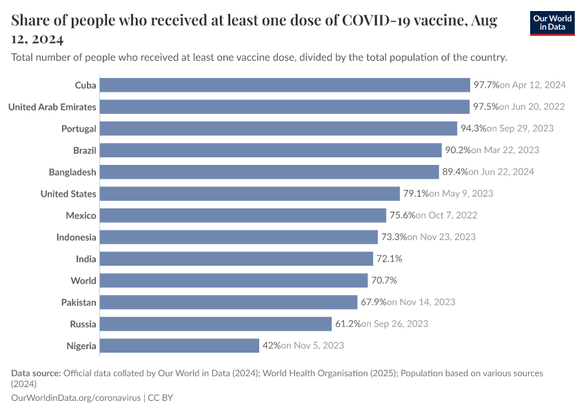 Edouard Mathieu, Hannah Ritchie, Lucas Rodés-Guirao, Cameron Appel, Daniel Gavrilov, Charlie Giattino, Joe Hasell, Bobbie Macdonald, Saloni Dattani, Diana Beltekian, Esteban Ortiz-Ospina, and Max Roser (2020) - “Coronavirus (COVID-19) Vaccinations” Published online at OurWorldinData.org. Retrieved from: 'https://country-profiles-in-search.owid.pages.dev/covid-vaccinations' [Online Resource]BibTeX citation