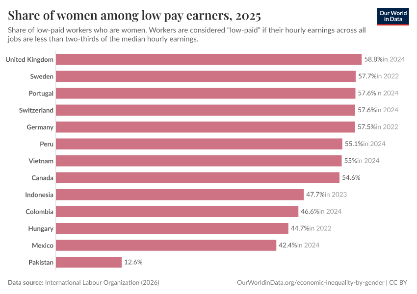 Above we show that women all over the world are underrepresented in high-profile jobs, which tend to be better paid. As it turns out, in many countries women are at the same time overrepresented in low-paying jobs.