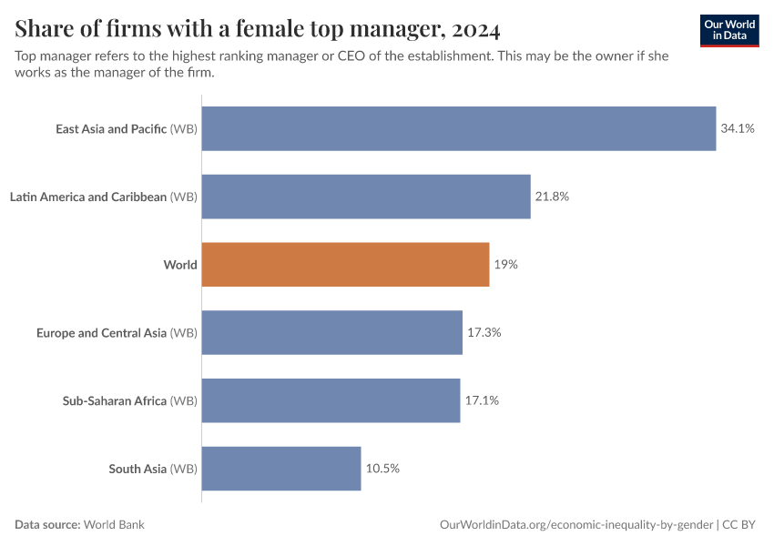 As we can see, all over the world firms tend to be managed by men. And, globally, only about 18% of firms have a female manager.