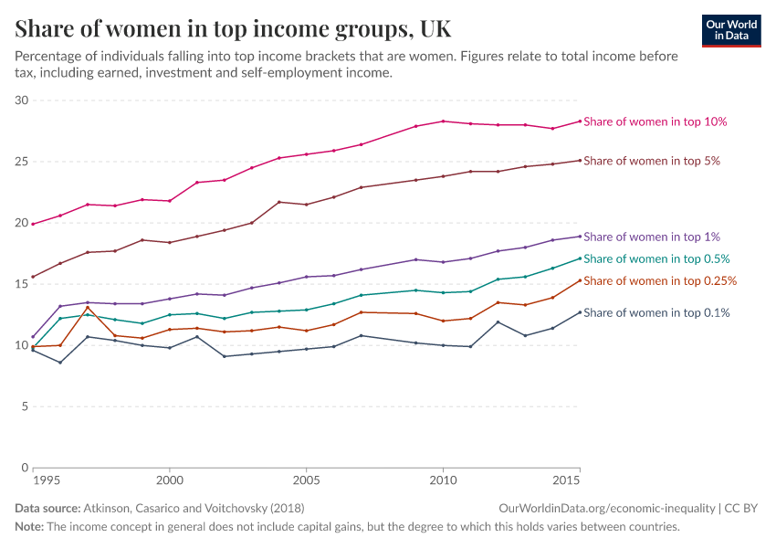 - Women are greatly under-represented in top income groups – they make up much less than 50% across each of the nine countries. Within the top 1% women account for around 20% and there is surprisingly little variation across countries.