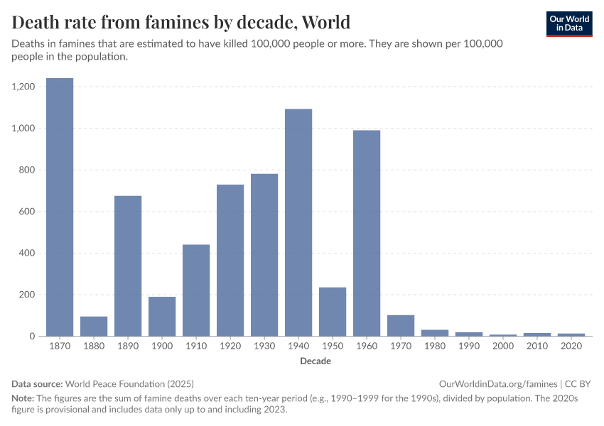 The sharp reduction in famine mortality represents "one of the great unacknowledged triumphs of our lifetime", as famine researcher, Alex de Waal describes it.5