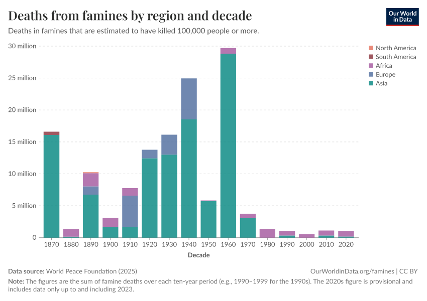There hasn’t been a large famine in North or South America since the late 19th century, and no large famine in Europe since the 1940s.
