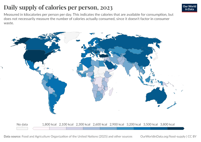 Max Roser, Hannah Ritchie, and Pablo Rosado (2013) - “Food Supply” Published online at OurWorldinData.org. Retrieved from: 'https://country-profiles-in-search.owid.pages.dev/food-supply' [Online Resource]BibTeX citation