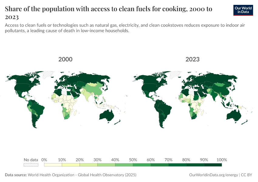 World Health Organization - Global Health Observatory (2025) – processed by Our World in Data. “Share of the population with access to clean fuels for cooking” [dataset]. World Health Organization, “Global Health Observatory” [original data]. Retrieved March 3, 2026 from https://country-profiles-in-search.owid.pages.dev/grapher/access-to-clean-fuels-and-technologies-for-cooking