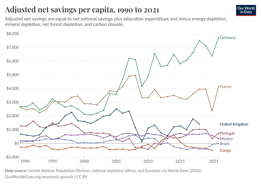 United Nations Population Division, national statistical offices, and Eurostat, via World Bank (2026) – processed by Our World in Data. “Adjusted net savings per capita” [dataset]. United Nations Population Division, national statistical offices, and Eurostat, via World Bank, “World Development Indicators 125” [original data]. Retrieved March 3, 2026 from https://country-profiles-in-search.owid.pages.dev/grapher/adjusted-net-savings-per-person