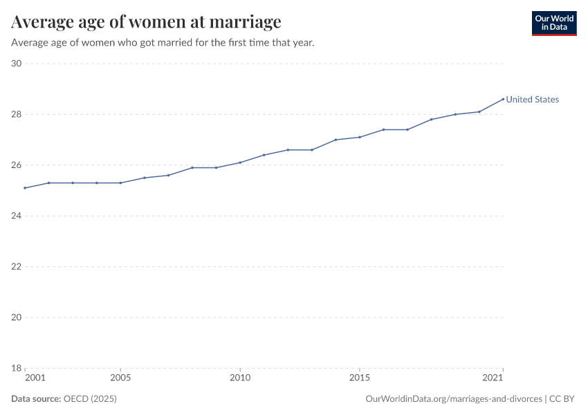 OECD (2025) – with minor processing by Our World in Data. “Average age of women at marriage” [dataset]. OECD, “OECD Family Database - Marriage and Divorce Rates” [original data]. Retrieved March 3, 2026 from https://country-profiles-in-search.owid.pages.dev/grapher/age-at-marriage-women