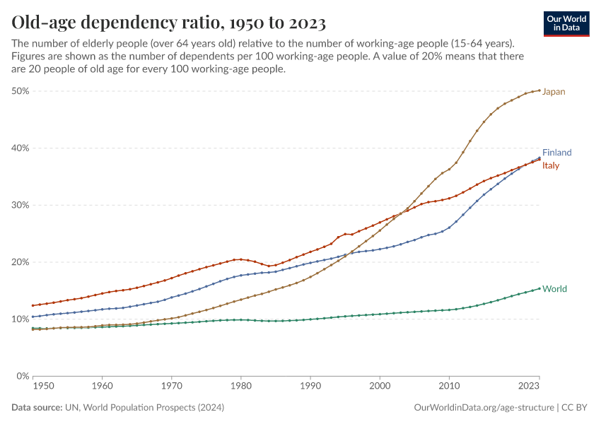 “Data Page: Old-age dependency ratio, age old”. Our World in Data (2026). Data adapted from United Nations. Retrieved from https://country-profiles-in-search.owid.pages.dev/grapher/age-dependency-ratio-old [online resource]How to cite this data