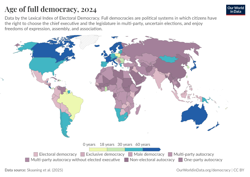 Skaaning et al. (2025) – processed by Our World in Data. “Age of full democracy” [dataset]. Skaaning et al., “Lexical Index of Electoral Democracy (LIED) v6.8” [original data]. Retrieved March 3, 2026 from https://country-profiles-in-search.owid.pages.dev/grapher/age-of-full-democracy
