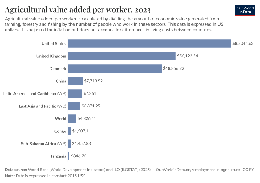 World Bank (World Development Indicators) and ILO (ILOSTAT) (2025) – processed by Our World in Data. “Agricultural value added per worker” [dataset]. World Bank (World Development Indicators) and ILO (ILOSTAT), “World Development Indicators 122” [original data]. Retrieved March 3, 2026 from https://country-profiles-in-search.owid.pages.dev/grapher/agriculture-value-added-per-worker-wdi