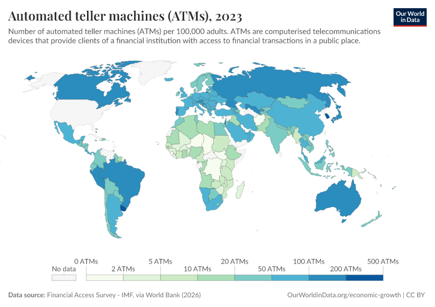 “Data Page: Automated teller machines (ATMs)”. Our World in Data (2026). Data adapted from Financial Access Survey - IMF, via World Bank. Retrieved from https://country-profiles-in-search.owid.pages.dev/grapher/automated-teller-machines-atms-per-100000-adults [online resource]How to cite this data