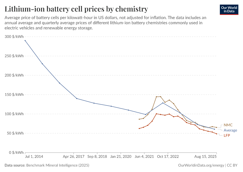 Benchmark Mineral Intelligence (2025) – with minor processing by Our World in Data. “Lithium-ion battery cell prices by chemistry” [dataset]. Benchmark Mineral Intelligence, “Lithium-ion battery prices”; Benchmark Mineral Intelligence, “Battery prices by chemistry” [original data]. Retrieved March 3, 2026 from https://country-profiles-in-search.owid.pages.dev/grapher/average-battery-cell-price