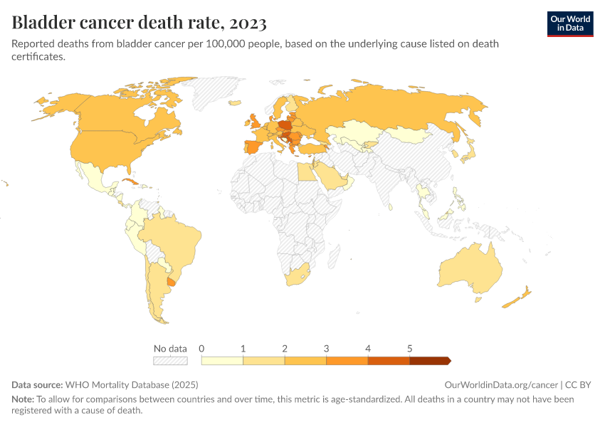 “Data Page: Bladder cancer death rate”, part of the following publication: Saloni Dattani, Fiona Spooner, Hannah Ritchie, and Max Roser (2023) - “Causes of Death”. Data adapted from WHO Mortality Database. Retrieved from https://country-profiles-in-search.owid.pages.dev/grapher/bladder-cancer-death-rate [online resource]How to cite this data