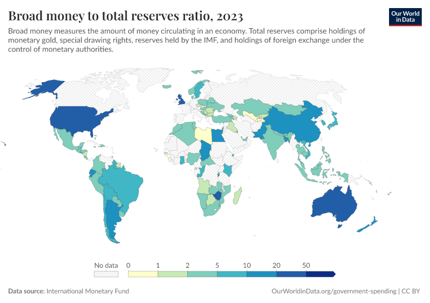 International Monetary Fund – processed by Our World in Data. “Broad money to total reserves ratio” [dataset]. International Monetary Fund, “International Monetary Fund, International Financial Statistics and data files.” [original data]. Retrieved March 3, 2026 from https://country-profiles-in-search.owid.pages.dev/grapher/broad-money-to-total-reserves-ratio