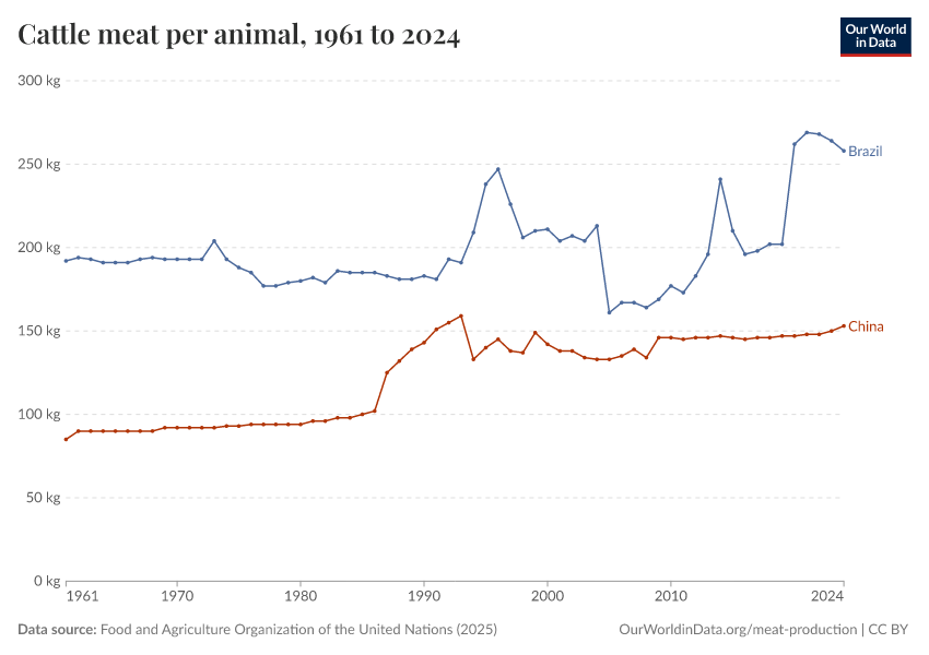 “Data Page: Cattle meat yield per animal”, part of the following publication: Hannah Ritchie, Pablo Rosado, and Max Roser (2023) - “Agricultural Production”. Data adapted from Food and Agriculture Organization of the United Nations. Retrieved from https://country-profiles-in-search.owid.pages.dev/grapher/cattle-meat-yields-hectograms-100-grams-per-animal [online resource]How to cite this data