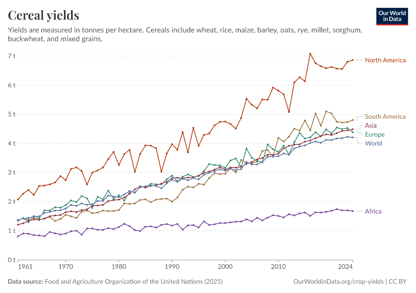 Food and Agriculture Organization of the United Nations (2025) – with major processing by Our World in Data. “Cereal yields – UN FAO” [dataset]. Food and Agriculture Organization of the United Nations, “Production: Crops and livestock products” [original data]. Retrieved March 3, 2026 from https://country-profiles-in-search.owid.pages.dev/grapher/cereal-yield