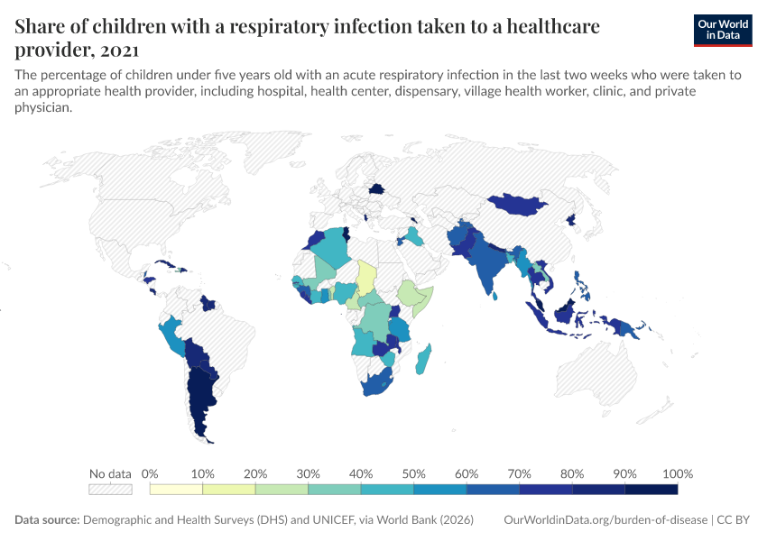 Demographic and Health Surveys (DHS) and UNICEF, via World Bank (2026) – processed by Our World in Data. “Share of children with a respiratory infection taken to a healthcare provider ” [dataset]. Demographic and Health Surveys (DHS) and UNICEF, via World Bank, “World Development Indicators 125” [original data]. Retrieved March 3, 2026 from https://country-profiles-in-search.owid.pages.dev/grapher/children-treated-ari