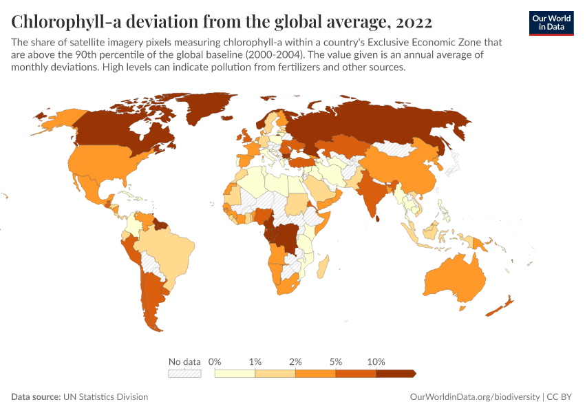 UN Statistics Division – processed by Our World in Data. “Chlorophyll-a deviation from the global average” [dataset]. UN Statistics Division, “World Environment Situation Room” [original data]. Retrieved March 3, 2026 from https://country-profiles-in-search.owid.pages.dev/grapher/chlorophyll-a-deviation-from-the-global-average