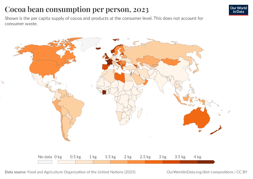 “Data Page: Yearly per capita supply of cocoa beans”. Our World in Data (2026). Data adapted from Food and Agriculture Organization of the United Nations. Retrieved from https://country-profiles-in-search.owid.pages.dev/grapher/chocolate-consumption-per-person [online resource]How to cite this data