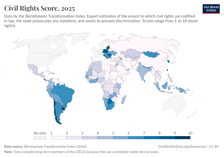 Bertelsmann Transformation Index (2024) – processed by Our World in Data. “Civil Rights Score” [dataset]. Bertelsmann Transformation Index, “Bertelsmann Transformation Index, Scores” [original data]. Retrieved March 3, 2026 from https://country-profiles-in-search.owid.pages.dev/grapher/civil-rights-score-bti