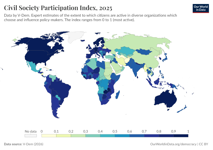 V-Dem (2025) – processed by Our World in Data. “Civil society participation index – V-Dem” [dataset]. V-Dem, “Democracy report v15” [original data]. Retrieved March 3, 2026 from https://country-profiles-in-search.owid.pages.dev/grapher/civil-society-participation-index