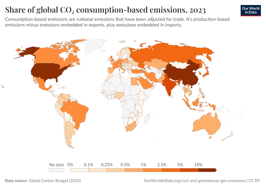 “Data Page: Share of global CO₂ consumption-based emissions”, part of the following publication: Hannah Ritchie, Pablo Rosado, and Max Roser (2023) - “CO₂ and Greenhouse Gas Emissions”. Data adapted from Global Carbon Project. Retrieved from https://country-profiles-in-search.owid.pages.dev/grapher/co2-consumption-share [online resource]How to cite this data
