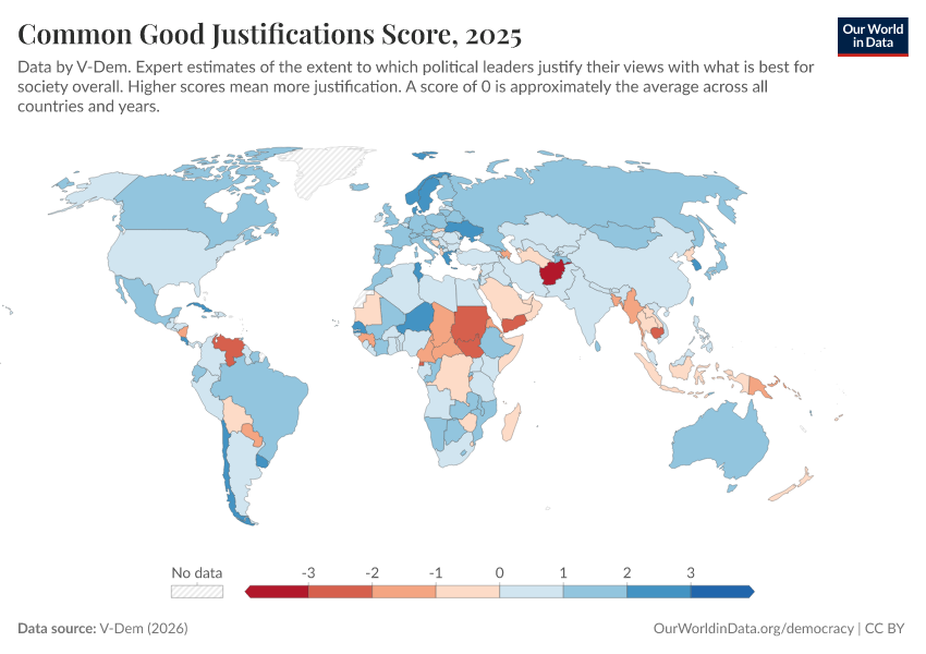 “Data Page: Common good justifications”, part of the following publication: Bastian Herre, Lucas Rodés-Guirao, and Esteban Ortiz-Ospina (2013) - “Democracy”. Data adapted from V-Dem. Retrieved from https://country-profiles-in-search.owid.pages.dev/grapher/common-good-justifications-score [online resource]How to cite this data