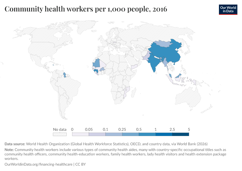 “Data Page: Community health workers per 1,000 people”. Our World in Data (2026). Data adapted from World Health Organization (Global Health Workforce Statistics), OECD, and country data, via World Bank. Retrieved from https://country-profiles-in-search.owid.pages.dev/grapher/community-health-workers [online resource]How to cite this data