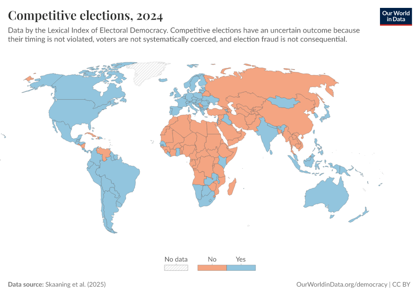 Skaaning et al. (2025) – processed by Our World in Data. “Competitive elections” [dataset]. Skaaning et al., “Lexical Index of Electoral Democracy (LIED) v6.8” [original data]. Retrieved March 3, 2026 from https://country-profiles-in-search.owid.pages.dev/grapher/competitive-elections-lexical