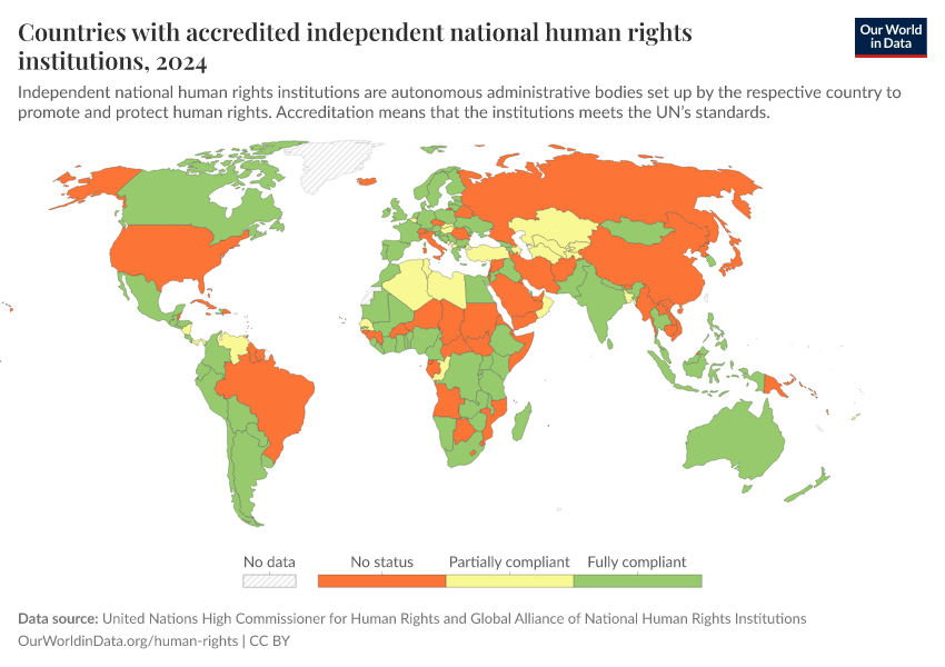 United Nations High Commissioner for Human Rights and Global Alliance of National Human Rights Institutions – processed by Our World in Data. “Countries with accredited independent national human rights institutions” [dataset]. United Nations High Commissioner for Human Rights and Global Alliance of National Human Rights Institutions, “Source: The Office of the United Nations High Commissioner for Human Rights (OHCHR) in collaboration with Global Alliance of National Human Rights Institutions (GANHRI).” [original data]. Retrieved March 3, 2026 from https://country-profiles-in-search.owid.pages.dev/grapher/countries-with-independent-national-human-rights-institution