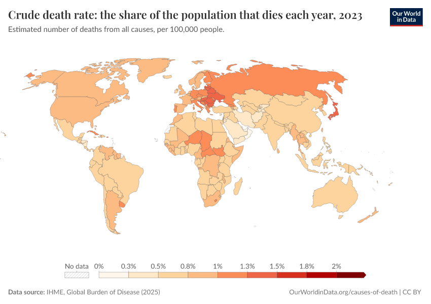 IHME, Global Burden of Disease (2025) – with major processing by Our World in Data. “Crude death rate: the share of the population that dies each year” [dataset]. IHME, Global Burden of Disease, “Global Burden of Disease - Deaths” [original data]. Retrieved March 3, 2026 from https://country-profiles-in-search.owid.pages.dev/grapher/crude-death-rate-the-share-of-the-population-that-dies-each-year-gbd