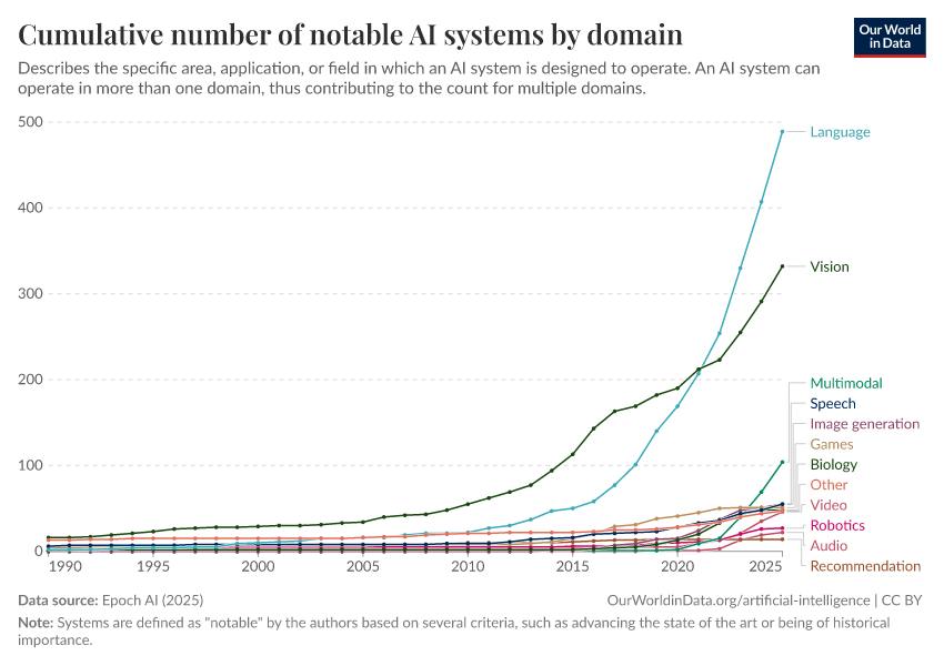 Epoch AI (2025) – with major processing by Our World in Data. “Cumulative number of notable AI systems by domain” [dataset]. Epoch AI, “Parameter, Compute and Data Trends in Machine Learning” [original data]. Retrieved March 3, 2026 from https://country-profiles-in-search.owid.pages.dev/grapher/cumulative-number-of-notable-ai-systems-by-domain