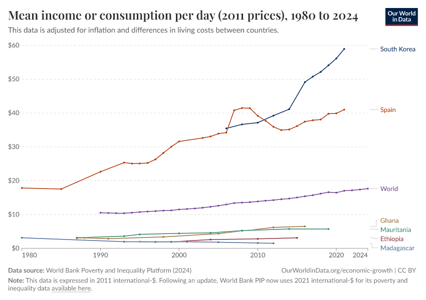 World Bank Poverty and Inequality Platform (2024) – with major processing by Our World in Data. “Mean income or consumption per day (2011 prices) – World Bank” [dataset]. World Bank Poverty and Inequality Platform, “World Bank Poverty and Inequality Platform (PIP) 20240627_2017, 20240627_2011” [original data]. Retrieved March 3, 2026 from https://country-profiles-in-search.owid.pages.dev/grapher/daily-mean-income-2011-ppp