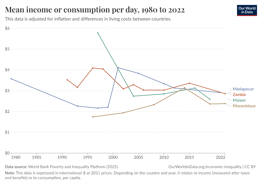 World Bank Poverty and Inequality Platform (2025) – with major processing by Our World in Data. “Mean income or consumption per day – World Bank” [dataset]. World Bank Poverty and Inequality Platform, “World Bank Poverty and Inequality Platform (PIP) 20250930_2021, 20250930_2017” [original data]. Retrieved March 3, 2026 from https://country-profiles-in-search.owid.pages.dev/grapher/daily-mean-income