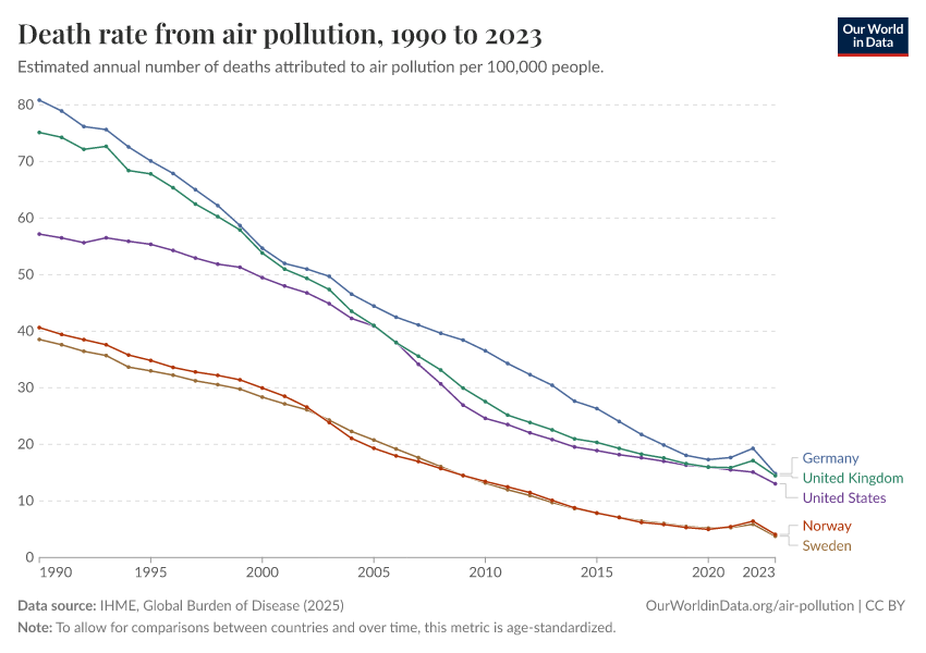 IHME, Global Burden of Disease (2025) – with major processing by Our World in Data. “Death rate from air pollution” [dataset]. IHME, Global Burden of Disease, “Global Burden of Disease - Risk Factors - Deaths” [original data]. Retrieved March 3, 2026 from https://country-profiles-in-search.owid.pages.dev/grapher/death-rate-from-air-pollution-per-100000