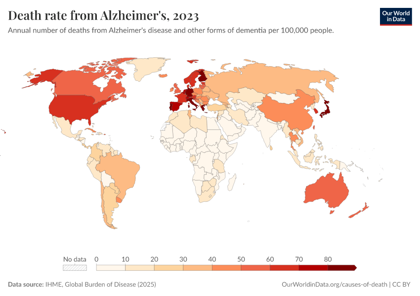 IHME, Global Burden of Disease (2025) – with major processing by Our World in Data. “Death rate from Alzheimer's” [dataset]. IHME, Global Burden of Disease, “Global Burden of Disease - Deaths” [original data]. Retrieved March 3, 2026 from https://country-profiles-in-search.owid.pages.dev/grapher/death-rate-from-alzheimers-other-dementias-gbd