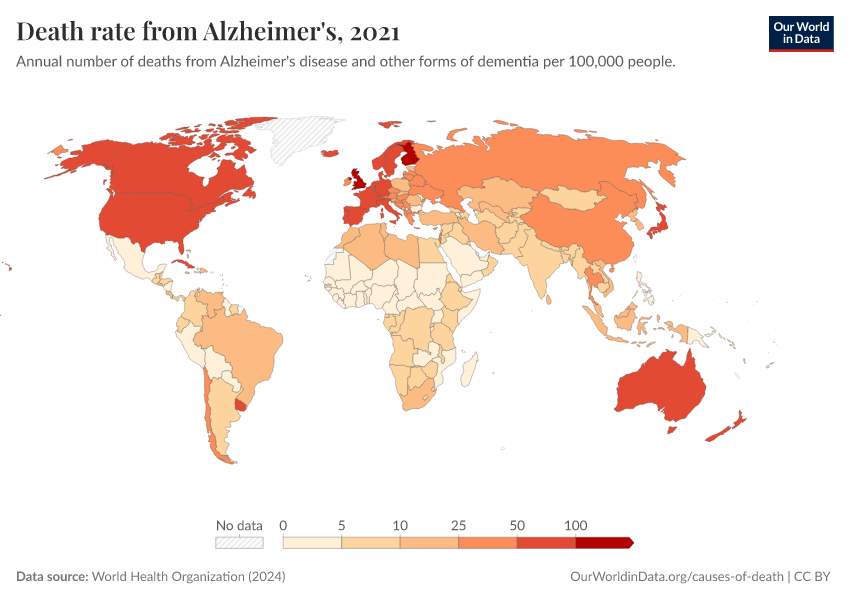 World Health Organization (2024) – with major processing by Our World in Data. “Death rate from Alzheimer's” [dataset]. World Health Organization, “Global Health Estimates” [original data]. Retrieved March 3, 2026 from https://country-profiles-in-search.owid.pages.dev/grapher/death-rate-from-alzheimers-other-dementias-ghe