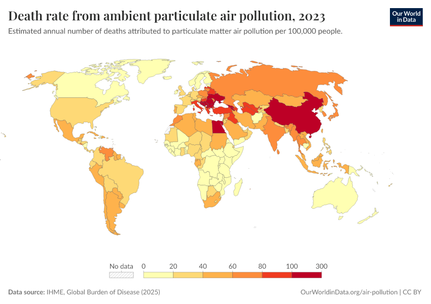 IHME, Global Burden of Disease (2025) – with major processing by Our World in Data. “Death rate from ambient particulate air pollution” [dataset]. IHME, Global Burden of Disease, “Global Burden of Disease - Risk Factors - Deaths” [original data]. Retrieved March 3, 2026 from https://country-profiles-in-search.owid.pages.dev/grapher/death-rate-from-ambient-particulate-air-pollution