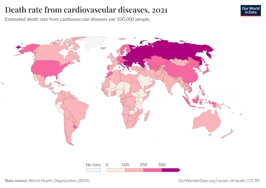 World Health Organization (2024) – with major processing by Our World in Data. “Death rate from cardiovascular diseases” [dataset]. World Health Organization, “Global Health Estimates” [original data]. Retrieved March 3, 2026 from https://country-profiles-in-search.owid.pages.dev/grapher/death-rate-from-cardiovascular-disease-ghe