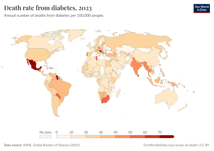 IHME, Global Burden of Disease (2025) – with major processing by Our World in Data. “Death rate from diabetes” [dataset]. IHME, Global Burden of Disease, “Global Burden of Disease - Deaths” [original data]. Retrieved March 3, 2026 from https://country-profiles-in-search.owid.pages.dev/grapher/death-rate-from-diabetes-gbd