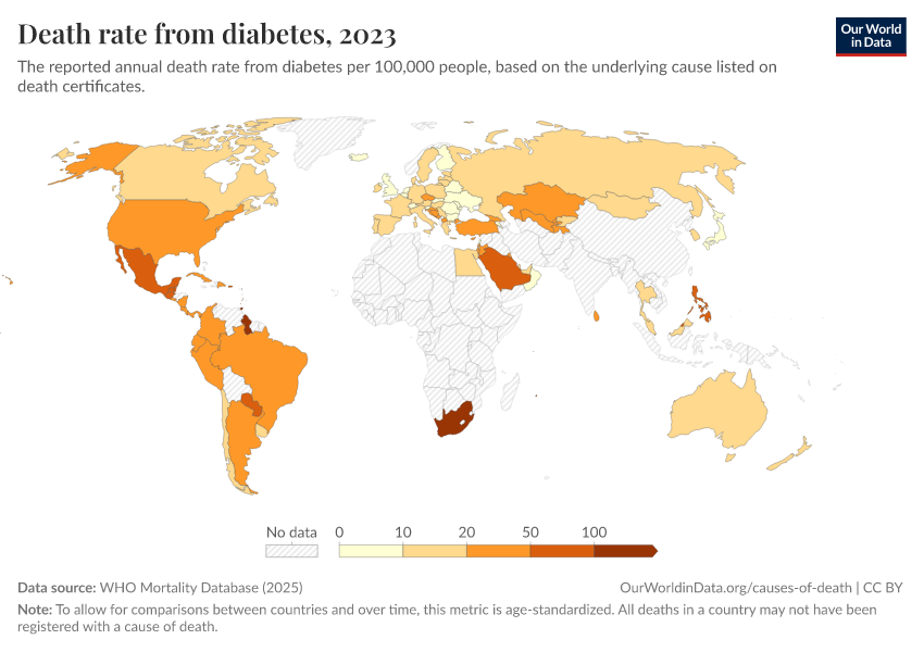WHO Mortality Database (2025) – with minor processing by Our World in Data. “Death rate from diabetes” [dataset]. WHO Mortality Database, “WHO Mortality Database” [original data]. Retrieved March 3, 2026 from https://country-profiles-in-search.owid.pages.dev/grapher/death-rate-from-diabetes-who-mdb
