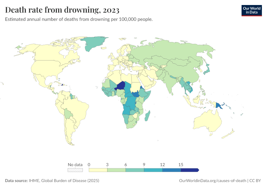 IHME, Global Burden of Disease (2025) – with major processing by Our World in Data. “Death rate from drowning” [dataset]. IHME, Global Burden of Disease, “Global Burden of Disease - Deaths” [original data]. Retrieved March 3, 2026 from https://country-profiles-in-search.owid.pages.dev/grapher/death-rate-from-drowning