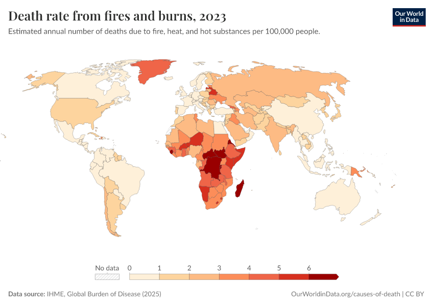 IHME, Global Burden of Disease (2025) – with major processing by Our World in Data. “Death rate from fires and burns” [dataset]. IHME, Global Burden of Disease, “Global Burden of Disease - Deaths” [original data]. Retrieved March 3, 2026 from https://country-profiles-in-search.owid.pages.dev/grapher/death-rate-from-fires-and-burns-ihme