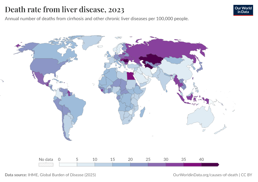 IHME, Global Burden of Disease (2025) – with major processing by Our World in Data. “Death rate from liver disease” [dataset]. IHME, Global Burden of Disease, “Global Burden of Disease - Deaths” [original data]. Retrieved March 3, 2026 from https://country-profiles-in-search.owid.pages.dev/grapher/death-rate-from-liver-disease-gbd