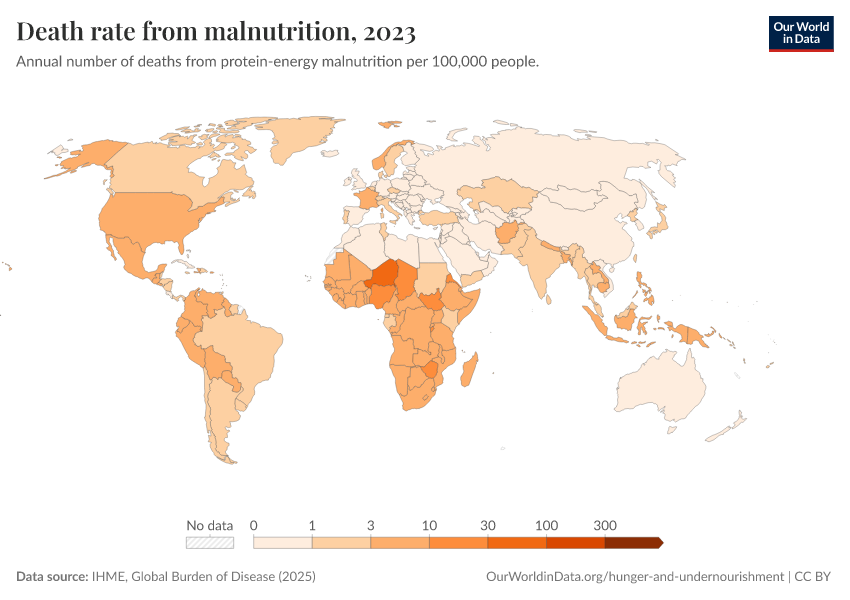 IHME, Global Burden of Disease (2025) – with major processing by Our World in Data. “Death rate from malnutrition” [dataset]. IHME, Global Burden of Disease, “Global Burden of Disease - Deaths” [original data]. Retrieved March 3, 2026 from https://country-profiles-in-search.owid.pages.dev/grapher/death-rate-from-malnutrition