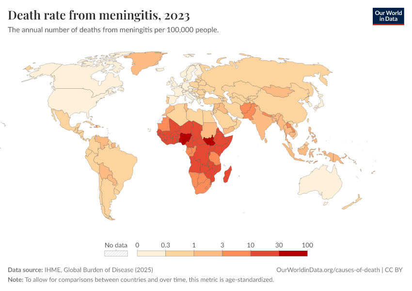 IHME, Global Burden of Disease (2025) – with major processing by Our World in Data. “Death rate from meningitis” [dataset]. IHME, Global Burden of Disease, “Global Burden of Disease - Deaths” [original data]. Retrieved March 3, 2026 from https://country-profiles-in-search.owid.pages.dev/grapher/death-rate-from-meningitis